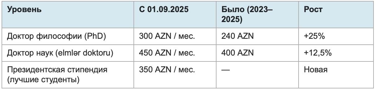 Президент Ильхам Алиев подписал распоряжение 23 июля 2025 года. С 1 сентября 2025 года стипендии для докторантов повышены — это уже второе повышение за три года (предыдущее было в январе 2023 года).
